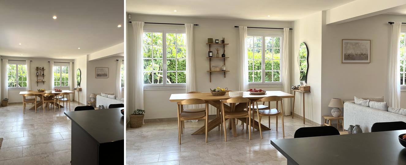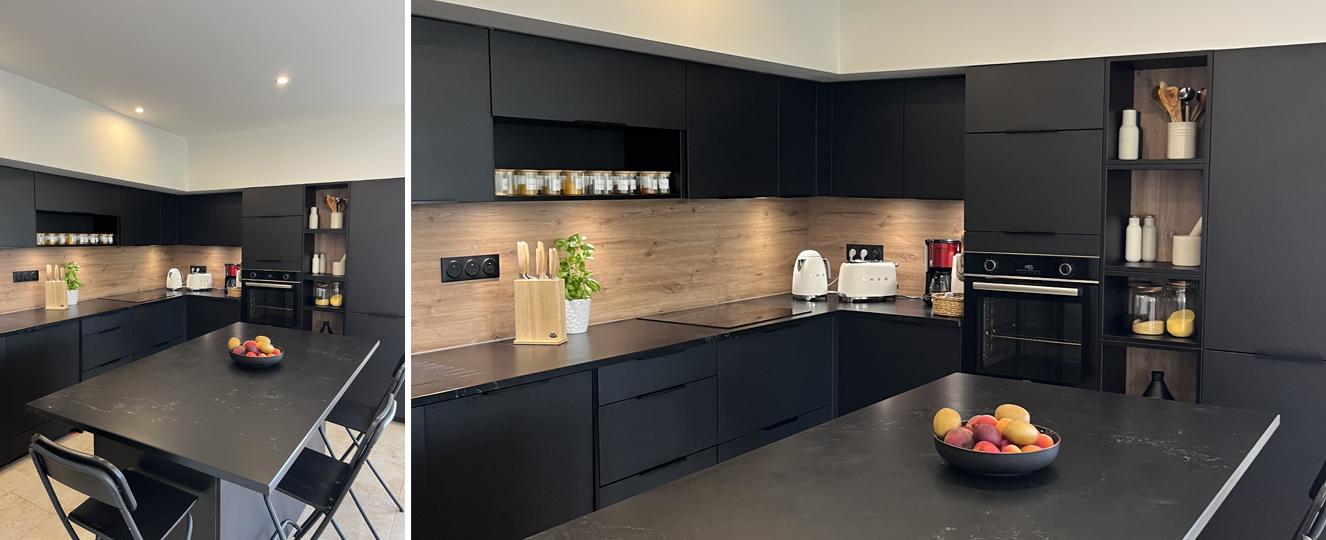 Vaste pièce à vivre (salon + salle à manger) ouverte sur la terrasse + cuisine ouverte, aménagée et équipée avec îlot central et plan de travail en quartz (Empira Black) |